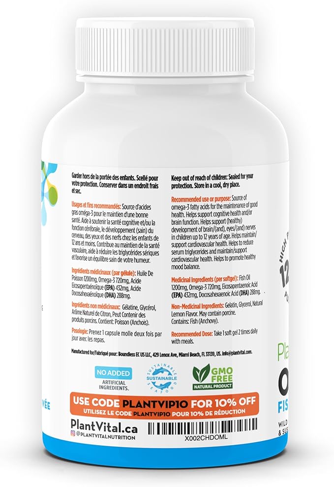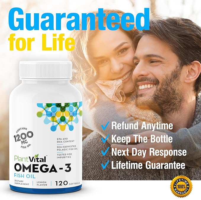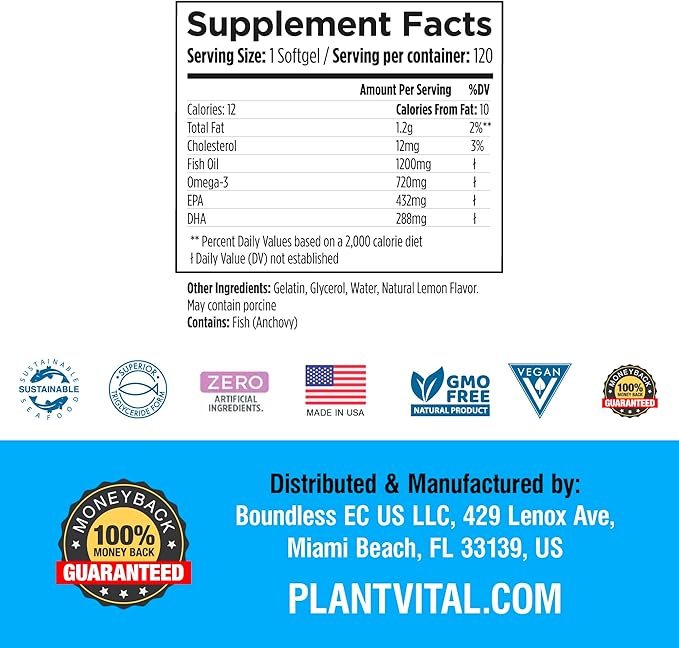 Plantvital Omega 3 Capsules- Pure Norwegian Omega 3 Fish Oil Supplements - Triple Strength- No Fish Flavor- Molecularly Distilled- Cognitive, Joint, Eye, Hair and Heart Health support-120 Capsules