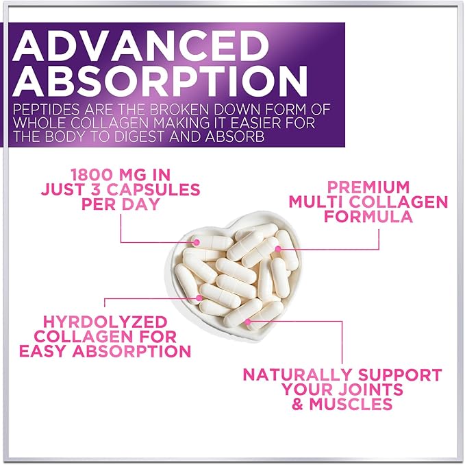 Collagen Peptides Powder Capsules for Women, 1800mg Hydrolyzed Collagen Type I, II, III, V & X, Hair, Nail, Skin, Bone & Joint Support, Collagen for Women & Men, Grass-Fed Collagen - 120 Capsules