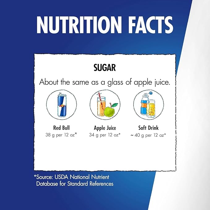 - Each 12 fl oz can contains 160 calories, 114mg of caffeine which helps to increase alertness, plus 38g of real sugar similar to a glass of apple juice of the same size
