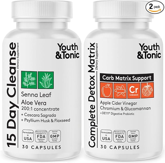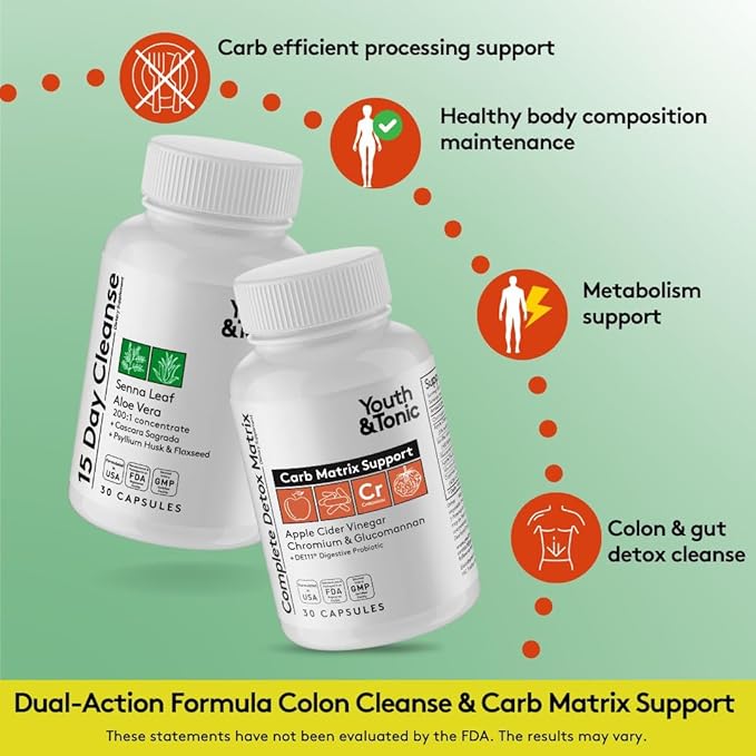 Youth & Tonic 15 Day Cleanse & Carb Matrix Support for Bloating, Gut & Metabolism Health, Break The Plateau, Feel Lighter & Energized, Colon Cleanser & Detox with ACV, Glucomannan, Chromium, 60 Pills