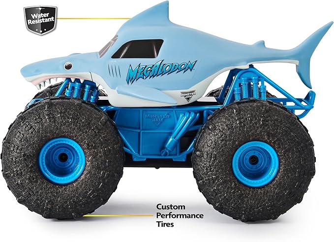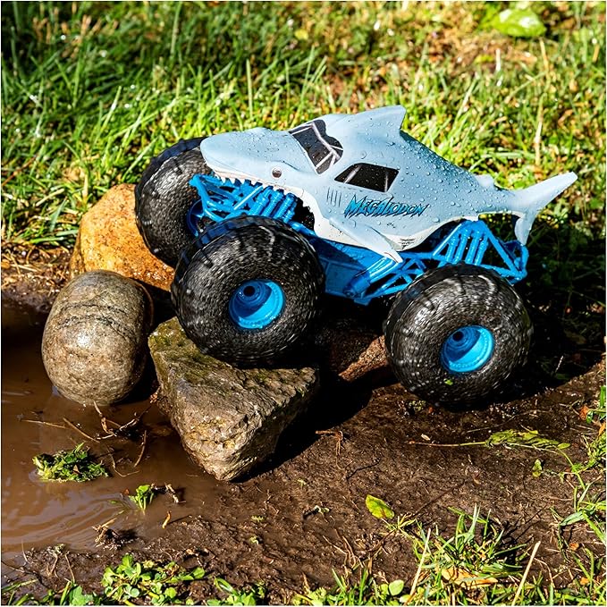 - DRIVE ON WATER: Featuring a water-resistant design and custom performance tires, Megalodon STORM attacks water with ease Drive from water to land and keep on going – this Megalodon RC is like no other