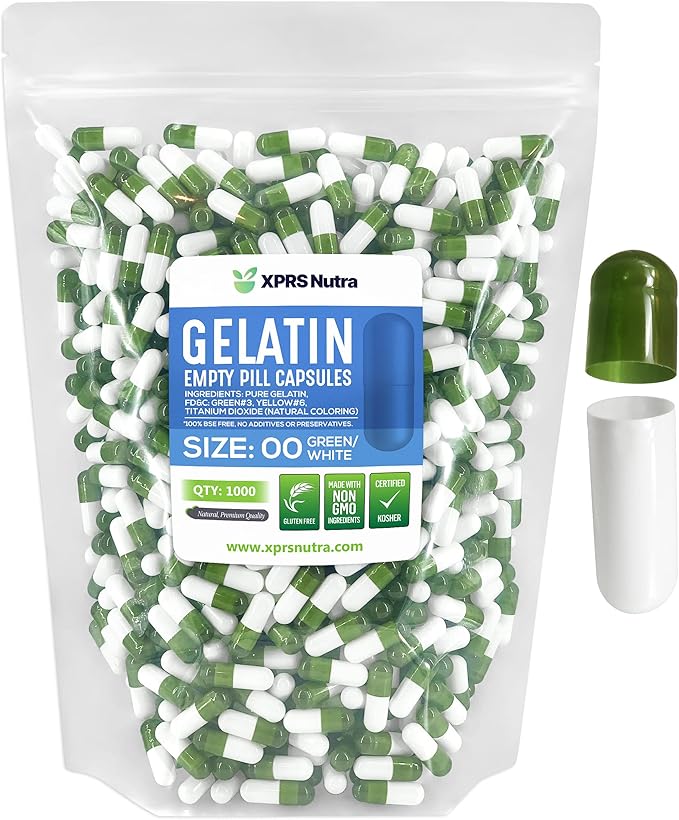 XPRS Nutra Size 00 Empty Capsules - 1000 Count Empty Gelatin Capsules - Empty Pill Capsules - DIY Capsule Filling - Fillable Pill Capsules Empty Gel Caps (Green/White)