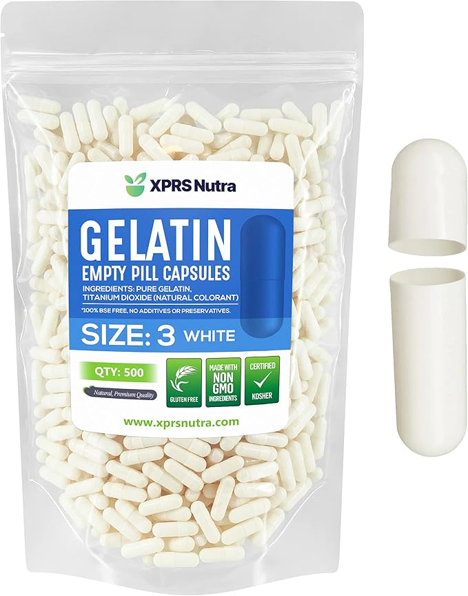 XPRS Nutra Size 3 Empty Capsules - 500 Empty Gelatin Capsules - Empty Pill Capsules - DIY Capsule Filling - Pure Bovine Pill Capsules Empty Gel Caps (White)