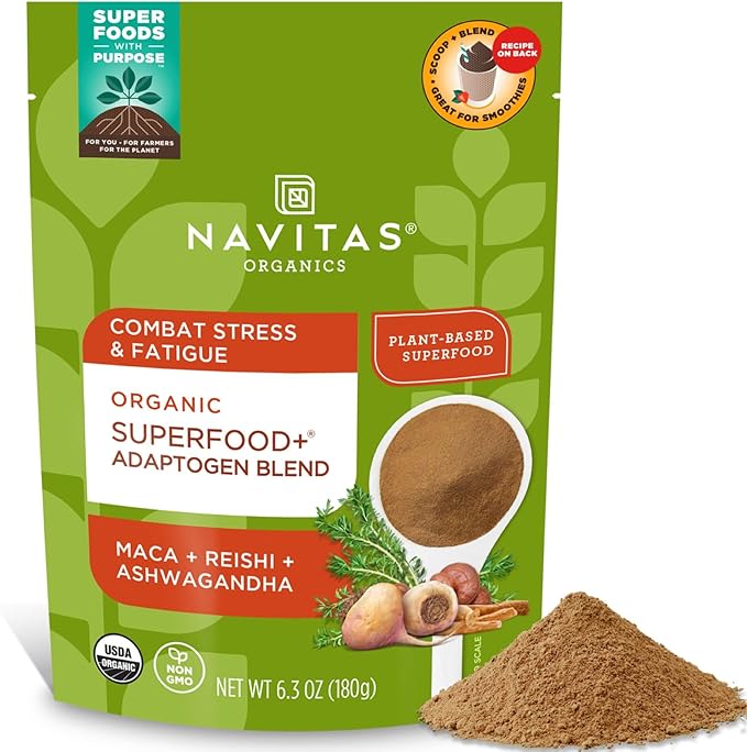 - Navitas Organics Superfood+ Adaptogen Blend is a convenient smoothie boost featuring three of nature’s most potent adaptogens to help you easily combat daily stress and fatigue.