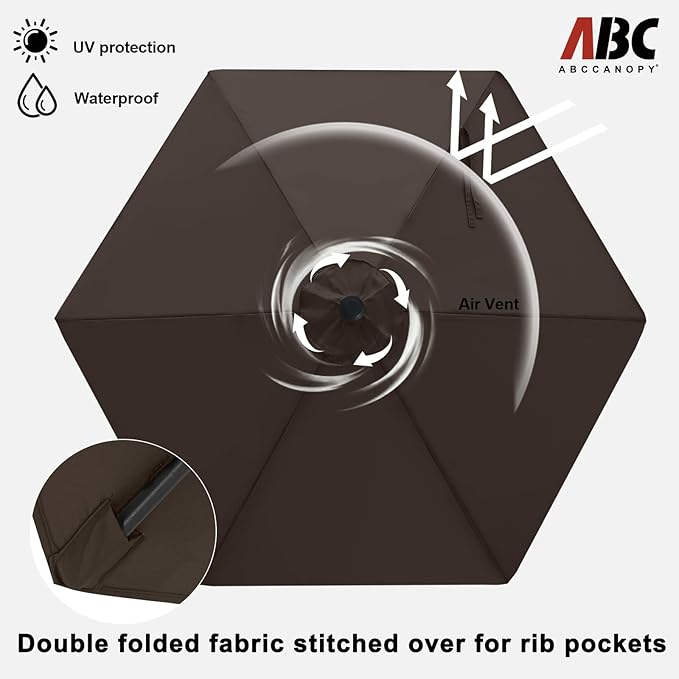 - Note:The umbrella base is not included in this item, please purchase separately if you need it or you can buy the ABCCANOPY umbrella base (ASIN: B07YKR1NFT) to match it. To avoid damage in extreme weather conditions, please close the outdoor tilt umbrella. In addition, one year after-sale protection for frame, six months after-sale protection for fabrics. If you have any question, don't hesitate, please contact us freely. We are here to make sure that you are satisfied.