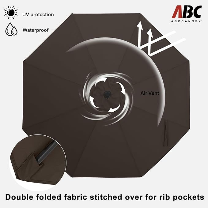 - Note:The umbrella base is not included in this item, please purchase separately if you need it or you can buy the ABCCANOPY umbrella base (ASIN: B07YKR1NFT) to match it. To avoid damage in extreme weather conditions, please close the outdoor tilt umbrella. In addition, one year after-sale protection for frame, six months after-sale protection for fabrics. If you have any question, don't hesitate, please contact us freely. We are here to make sure that you are satisfied.