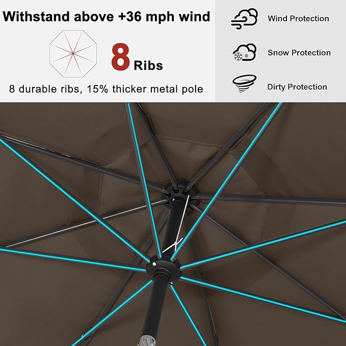 - Sturdy Aluminum Pole: Rust-Free Powder Coated Aluminum Pole and 8 Aluminum Ribs provides superior strength support that resists wind better. 1.5in diameter strong pole to match your patio table.