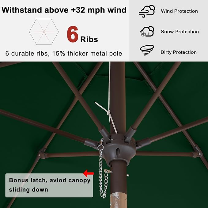 - ★ Anti rust powder coated Aluminum pole and 8 Aluminum ribs for providing good stable support, making it excellent in wind resistance, and also preventing from outer layer peeling. 1.5in diameter strong pole to match your patio table.