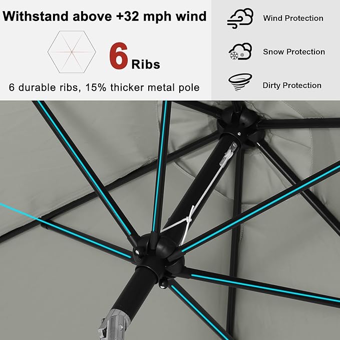 - ★ Anti rust powder coated Aluminum pole and 8 Aluminum ribs for providing good stable support, making it excellent in wind resistance, and also preventing from outer layer peeling. 1.5in diameter strong pole to match your patio table.