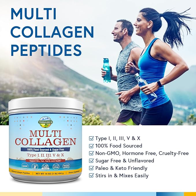 Terranics Multi Collagen Peptides Powder, Type I II III V X Hydrolyzed Collagen for Women+Men, Collagen Supplements for Skin Nail Hair & Joint, Fast Dissolve, Unflavored Colageno, No Sugar, Keto, 16oz