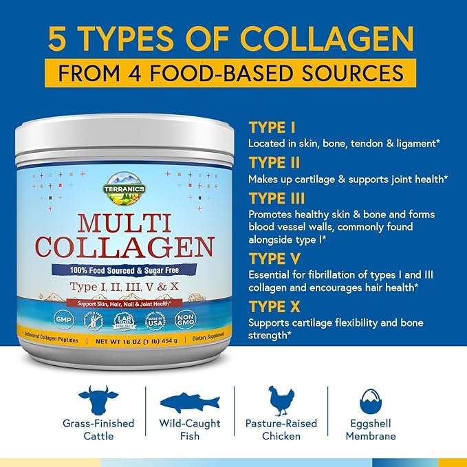 - 100% Ethically Sourced: Terranics Multi Collagen Peptides Powder comes from 4 premium real food sources - pasture-raised & cage-free cattle and chickens, wild-caught deep-sea fish and U.S. farmed eggs. This premium multi collagen protein powder does NOT contain peanuts, tree nuts, shellfish, corn, milk, soybean, wheat or growth hormones.