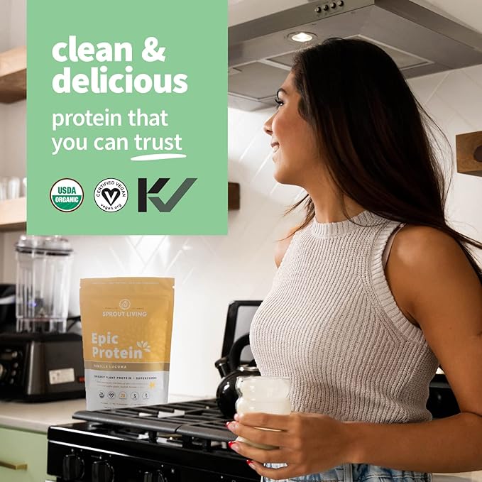 Sprout Living Epic Protein, Plant Based Protein & Superfoods Powder, Vanilla Lucuma Powder | 20 Grams Organic Protein Powder, Vegan, Non Dairy, Non-GMO, Gluten Free, Low Sugar (2 Pound, 24 Servings)