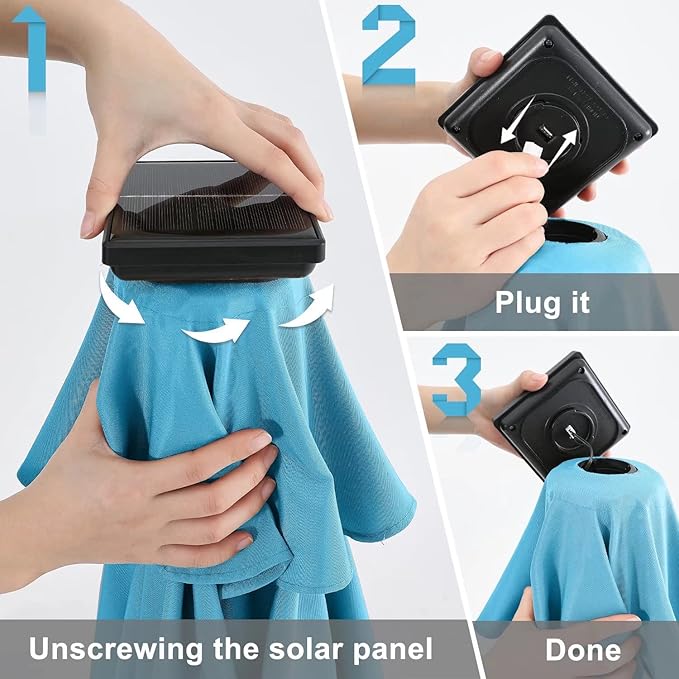 - ★ Hassle-free setup and storage with a detachable pole and crank handle; NOTICE: Please check the plug connection by unscrewing the solar panel before use, and the solar panel should be exposed to sun for 6-9 hours . If the light still not work, please contact us, we will solve this problem for you. Umbrella base not included