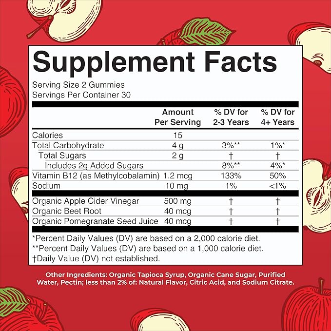 - Per Serving (2 Gummies): 500 mg Apple Cider Vinegar; 1.2 mcg Vitamin B12; 40 mcg Organic Beet Root; 40 mcg Organic Pomegranate Juice. Other Ingredients: Organic Tapioca Syrup, Organic Cane Sugar, Purified Water, Pectin, Natural Apple Flavor, Citric Acid, Sodium Citrate.