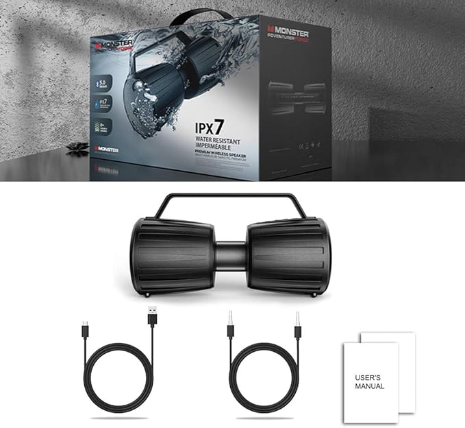 - What You Get-MONSTER Adventurer Force Bluetooth Speaker*1 ,USB-C charging cable*1, AUX cable*1, Quick Start Guide*1. 12 month Worry-Free Service, and our lifetime customer service (1-8 hours). Any questions please feel free to contact us.