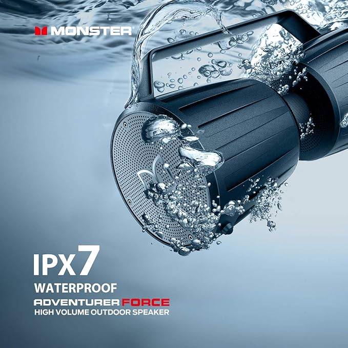- IPX7 Waterproof Speakers-With IPX7 certificated, Monster Adventurer Force portable Bluetooth speaker can withstand full immersion of up to 30 minutes over 3 feet. Built-in 7.4v/4000mAh lithium battery,it guarantees up to 40 hours of continuous playtime at 50% volume!