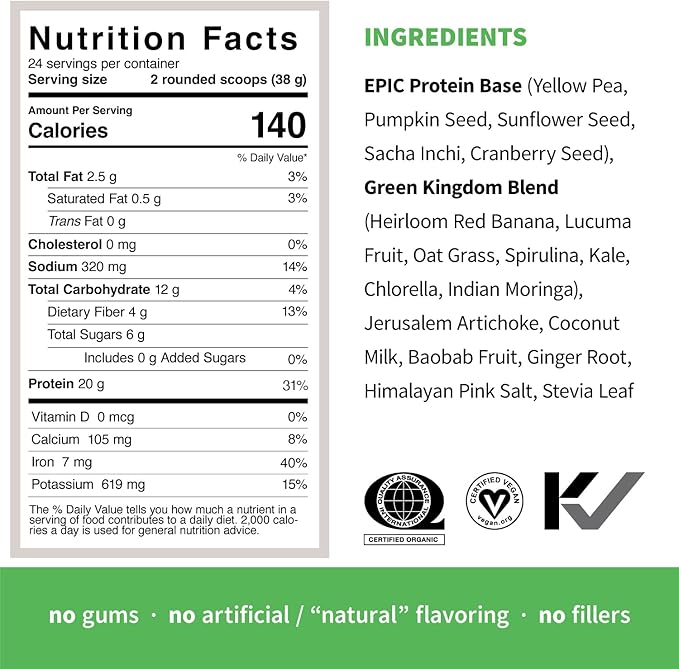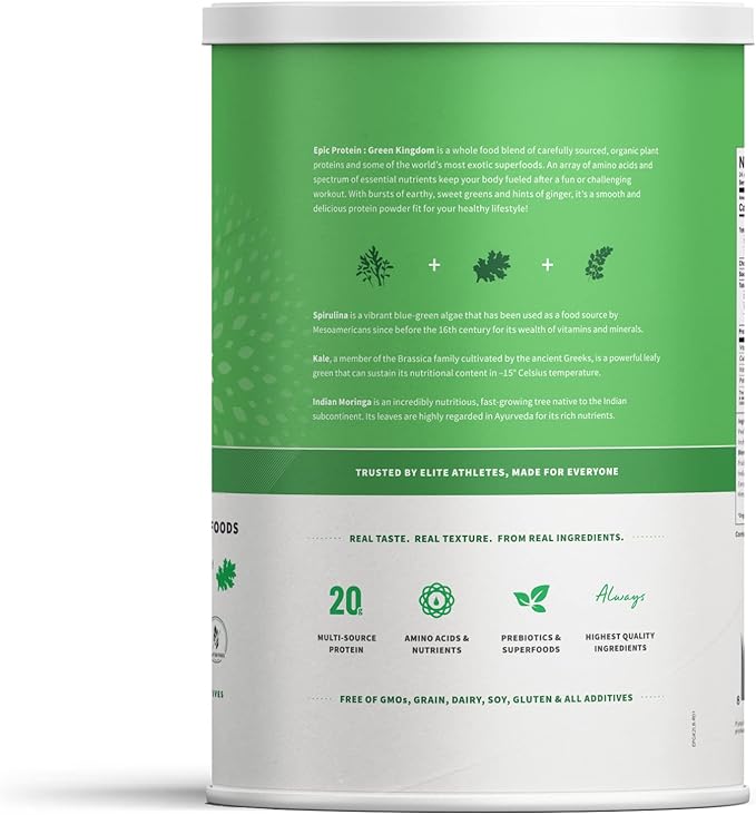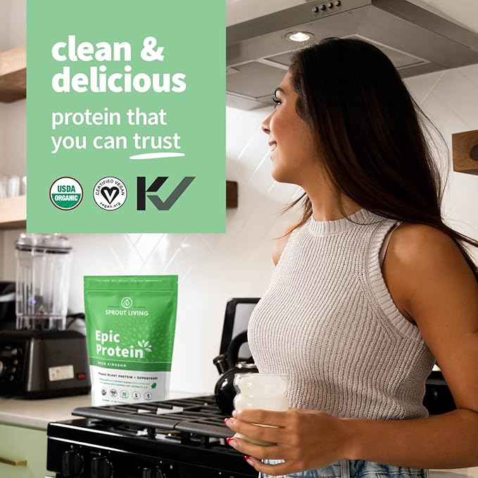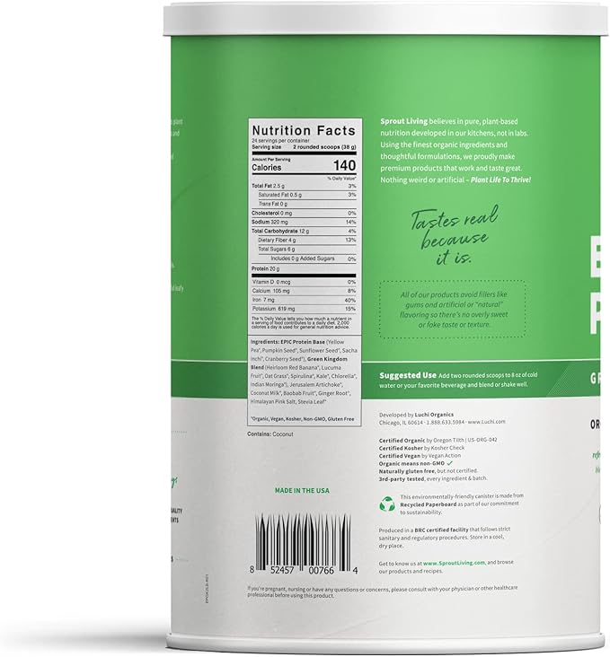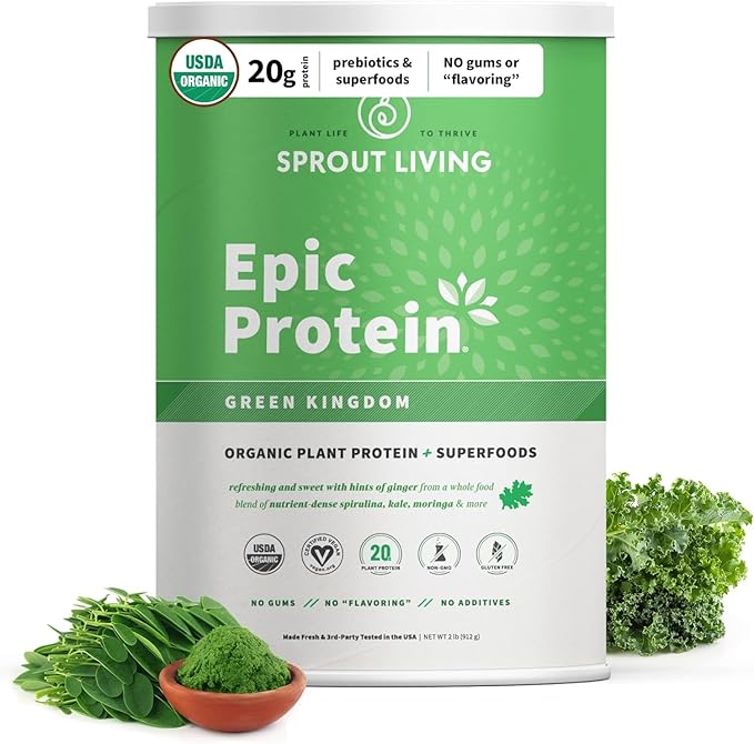 Sprout Living Epic Protein, Plant Based Protein & Superfoods Powder, Green Kingdom | 20 Grams Organic Protein Powder, Greens, Vegan, Non Dairy, Non-GMO, Gluten Free, Low Sugar (2 Pound, 24 Servings)