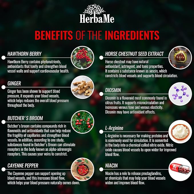 - Blood Pressure Support – Rich in Niacin, Hawthorne, L-Arginine, Diosmin, Horse Chestnut and Ginger Root our poor circulation supplement can reduce pressure in the legs while fortifying vein health for a slimmer, more toned look with proper blood flow.