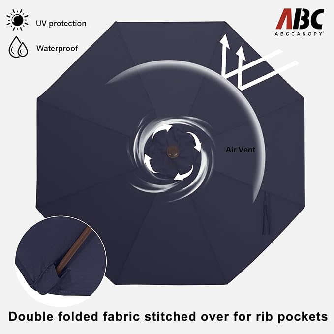- Simple Crank System/Tilt Adjustment: The crank patio umbrellas has a simple tilt button, tilt with push button to maximize shade by tilt umbrella as the sun's position changes.The large patio umbrella provide more angled shadows and cover more different areas.