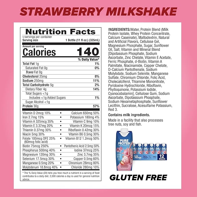 - HIGH PROTEIN, LOW SUGAR(1), GREAT TASTE. Enjoy this delicious low-fat, non-GMO shake with 30g of complete protein per serving to support your muscle strength; gluten-free and just 140 calories, these RTDs include 24 added vitamins and minerals—including vitamins A, C, D, and E plus Zinc to support immune health—but less than 1g of sugar
