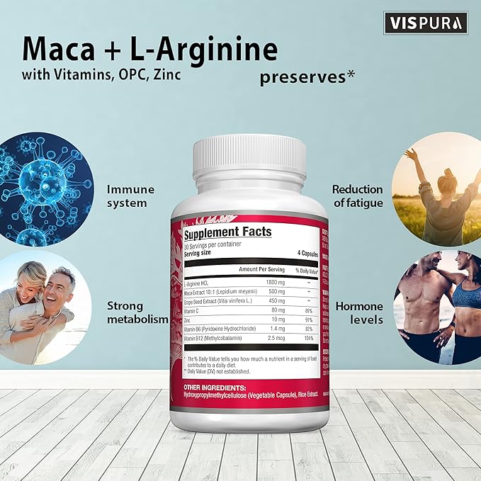 - Extra-Strength Support – Along with maca extract we’ve also added 1800 mg of L-Arginine as well as Grape Seed extract, Vitamins B6 and B12, and zinc to help round out the support provided in every single dose.