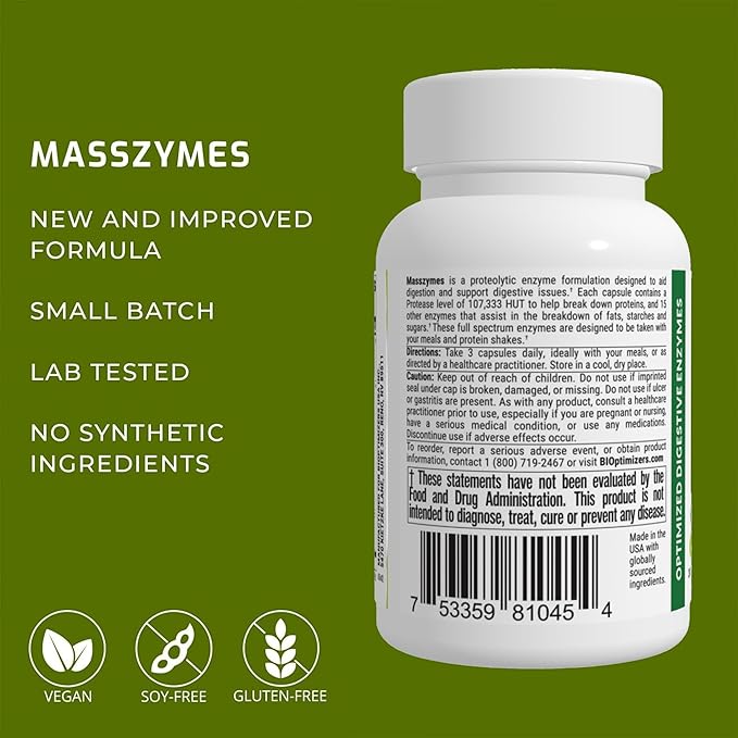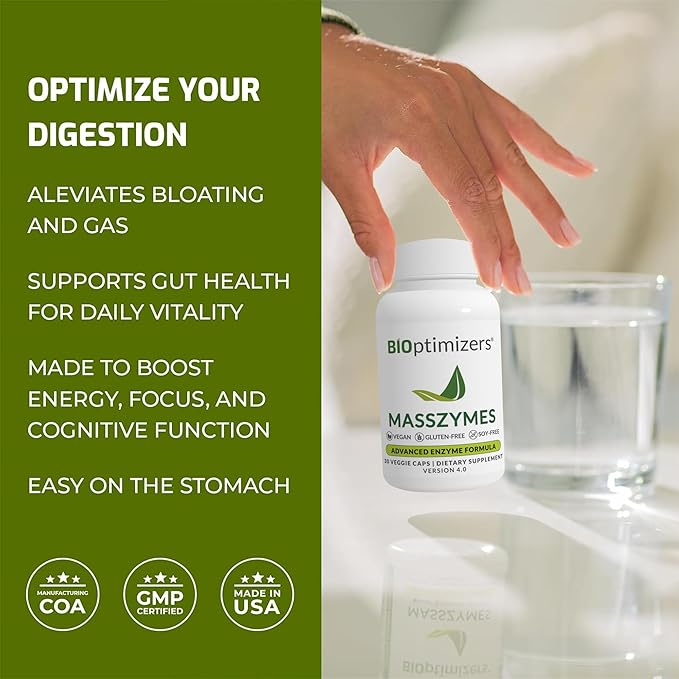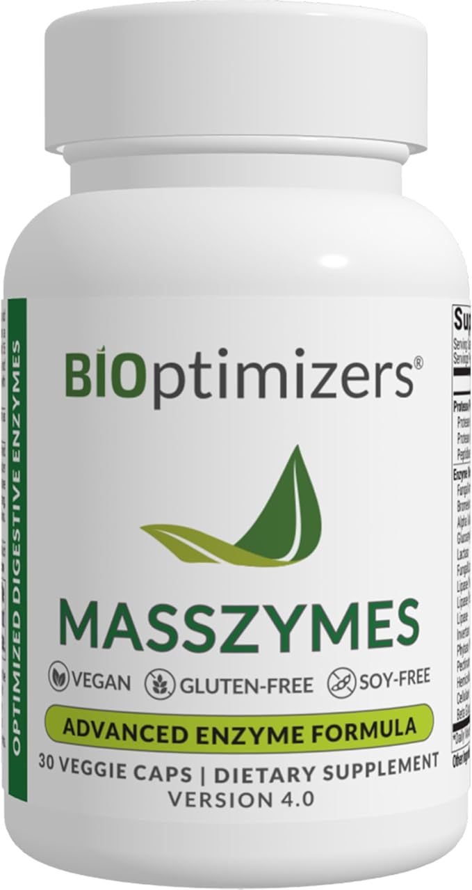 BiOptimizers - MassZymes 4.0 with AstraZyme - Digestive Enzyme Supplement for Better Absorption - Relief from Bloating, Constipation, and Gas - Contains Lipase, Amylase, and Bromelain, 30 Capsules