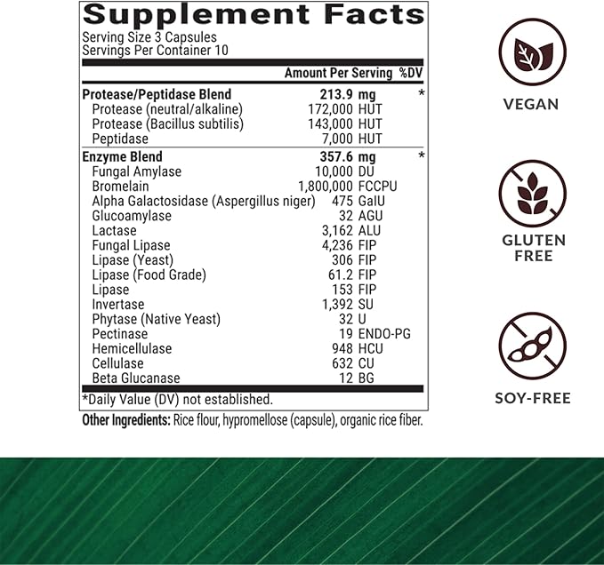 - VEGETARIAN- AND VEGAN-FRIENDLY: This digestive supplement is derived from a plant-based formulation that does not contain any fillers or artificial ingredients, is dairy-free, and soy-free.