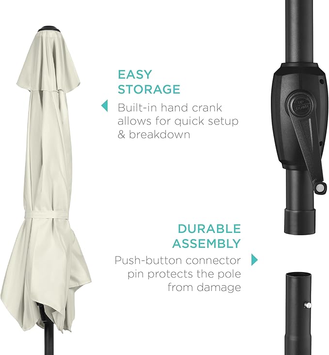 - USER-FRIENDLY MECHANISMS: Features a hand-operated crank to open and close the umbrella with ease, while a push-button tilt system adds extra security against the sun
