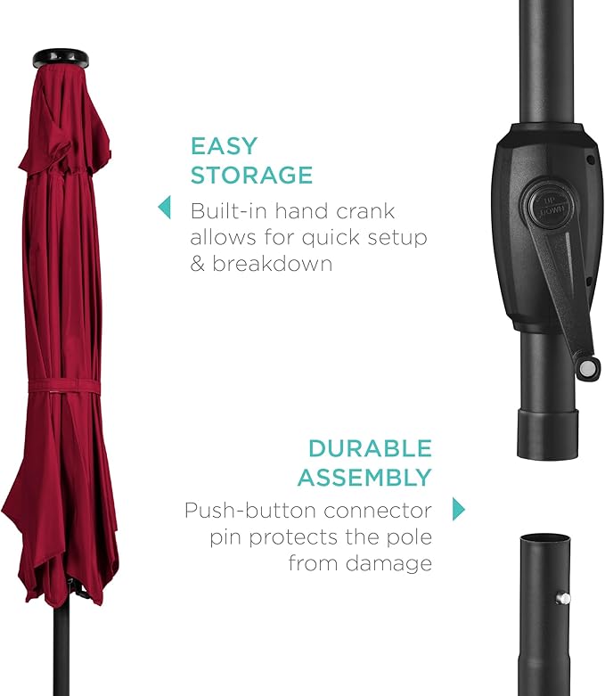 - USER-FRIENDLY MECHANISMS: Features a hand-operated crank to open and close the umbrella with ease, while a push-button tilt system adds extra protection for the sun