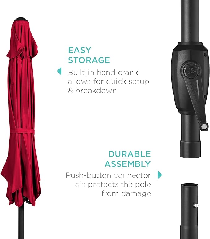 - USER-FRIENDLY MECHANISMS: Features a hand-operated crank to open and close the umbrella with ease, while a push-button tilt system adds extra security against the sun
