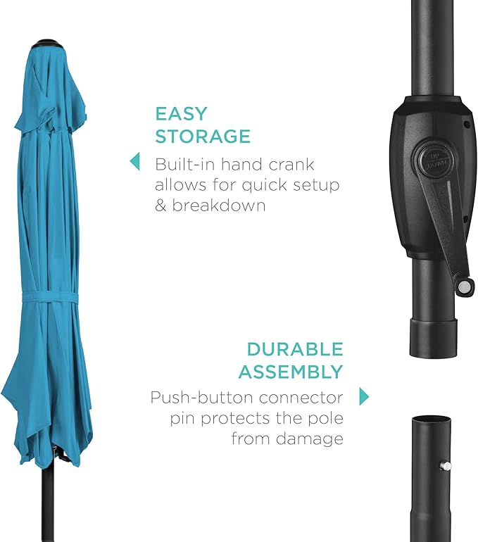 - USER-FRIENDLY MECHANISMS: Features a hand-operated crank to open and close the umbrella with ease, while a push-button tilt system adds extra security against the sun