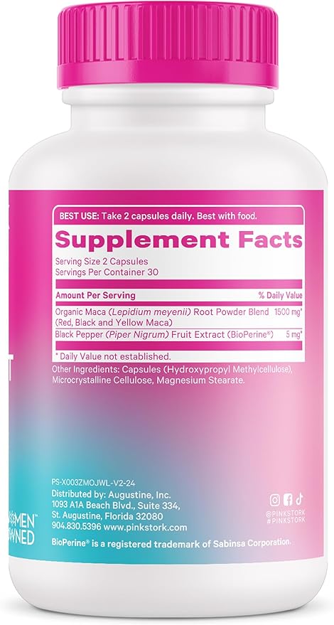 - Female Hormone Balance Supplement: Pink Stork Maca Root capsules offer a blend of red, black, and yellow maca root, providing botanical support for women's hormone balance, helping to manage stress levels and mood health. This hormonal balance helps support period regularity and ovulation - crucial for women trying to conceive.