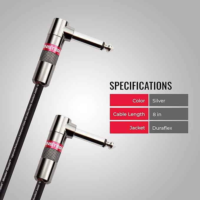 Monster Prolink Classic Instrument Guitar Cable - 8 in Right Angle to Right Angle Instrument Cable. All Metal & Duraflex Outer Jacket. 90% Copper Braided Shield Monster Instrument Cable