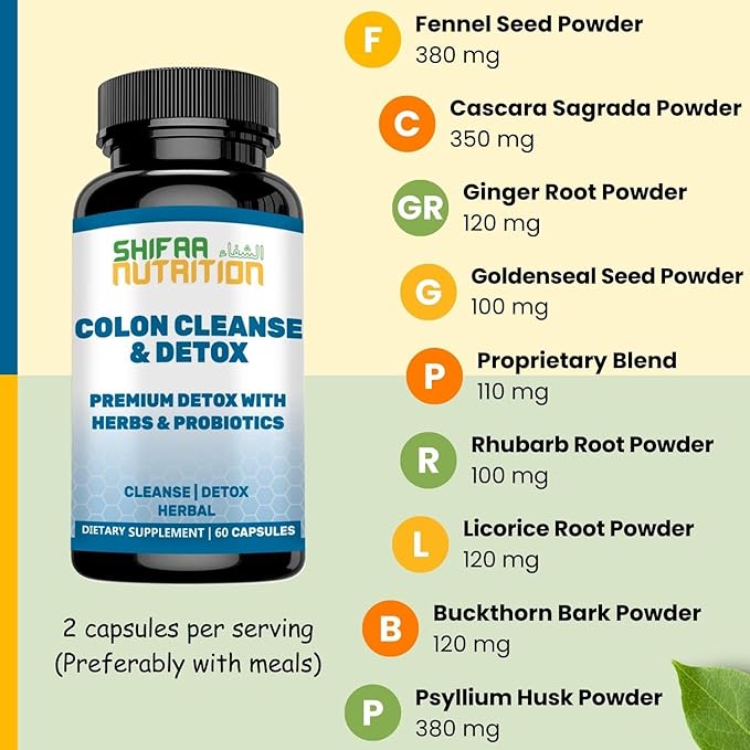 - THE SUPPLEMENT: SHIFAA NUTRITION Colon Cleanse And Detox Supplement Contains 60 Capsules. With 2 Capsules Per Serving it will Give You 30 Servings Of Our Dietary Supplement. Colon Cleanse and Detox are Also Referred To As Body Detox, Body Cleanse, Detox Cleanse, etc.