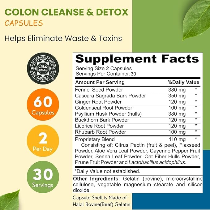Premium Colon Cleanse & Herbal Detox Pills | 2x15 Days Supply | with Probiotics, Fennel Seed, Cascara Sagrada & Ginger Root Halal Vitamins