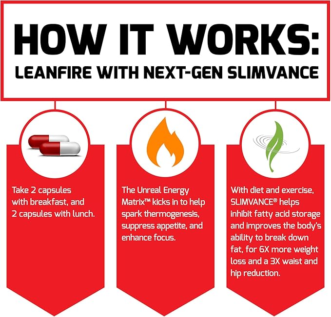 - TRUE WEIGHT LOSS BREAKTHROUGH: For years, diet pills have notoriously produced mixed results, casting doubt on their effectiveness entirely. After nearly 30 years of mediocre formulas, the next generation in weight-loss science has arrived. LeanFire with Next-Gen SLIMVANCE is engineered to deliver comprehensive weight loss results in three phases: restrict fat production, prevent fat storage, and ignite fat oxidation.