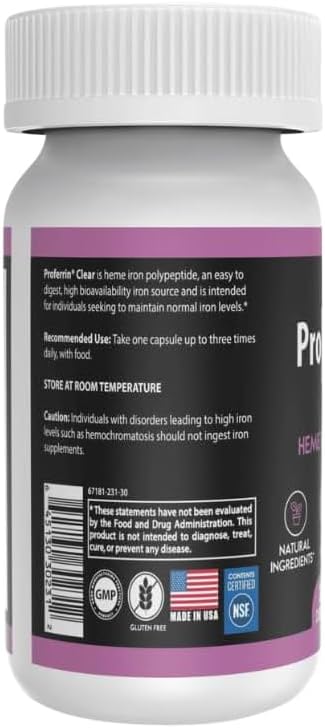 Proferrin Clear 30ct | US Made heme Iron for high Absorption, Easy on GI Tract | Natural, NSF Certified, dye Free