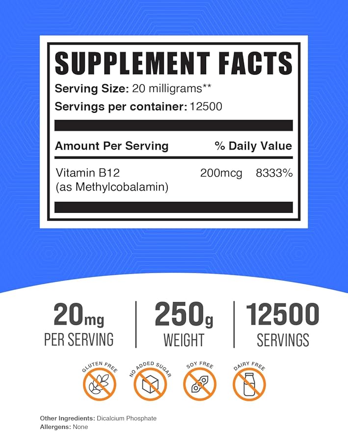 BulkSupplements.com Vitamin B12 Methylcobalamin Powder - 1% B12 Methylcobalamin, Essential B Vitamin - B12 Supplement, Gluten Free, 20mg per Serving, 250g (8.8 oz) (Pack of 1)