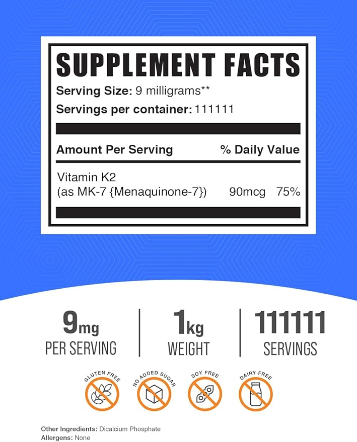 BulkSupplements.com Vitamin K2 Powder - Vitamin K2 MK-7, as Menaquinone Powder - K2 Vitamin Supplement for Wellness, Gluten Free, 9mg per Serving, 1kg (2.2 lbs) (Pack of 1)