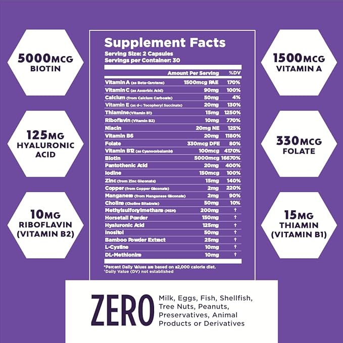 - Hair Skin and Nail Supplement: Our vitamin b blend, collagen and hyaluronic acid promotes smooth skin, long hair and strong nails. Our blend also contains biotin, collagen, vitamin a and e, vitamin b6 and other vitamins that also makes this a great daily multi-vitamin.