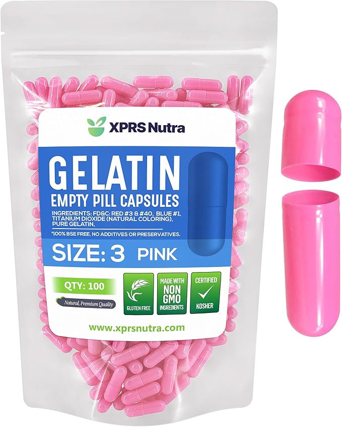 XPRS Nutra Size 3 Empty Capsules - 100 Count Empty Gelatin Capsules - Empty Pill Capsules - DIY Capsule Filling - Pure Bovine Pill Capsules Empty Gel Caps (Pink)