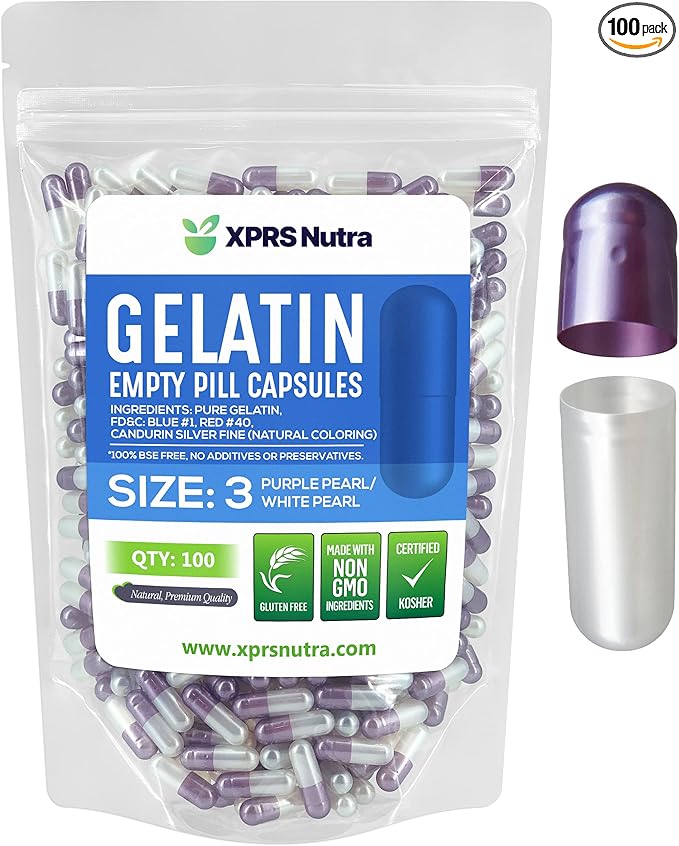 XPRS Nutra Size 3 Empty Capsules - 100 Count Empty Gelatin Capsules - Empty Pill Capsules - DIY Capsule Filling - Pure Bovine Pill Capsules Empty Gel Caps (Pearl Purple/White)