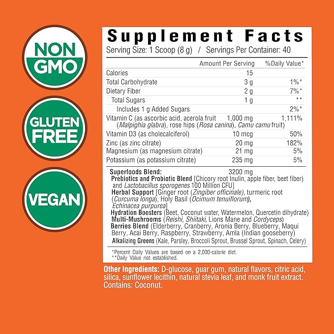 - Supports hydration with coconut water & more: immune defense Superfoods provides coconut water, Watermelon and beet to bolster electrolyte levels and support hydration.