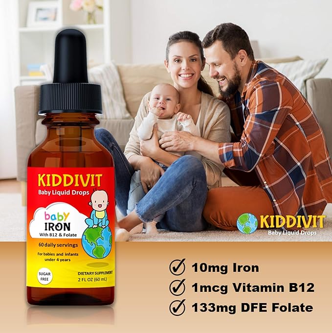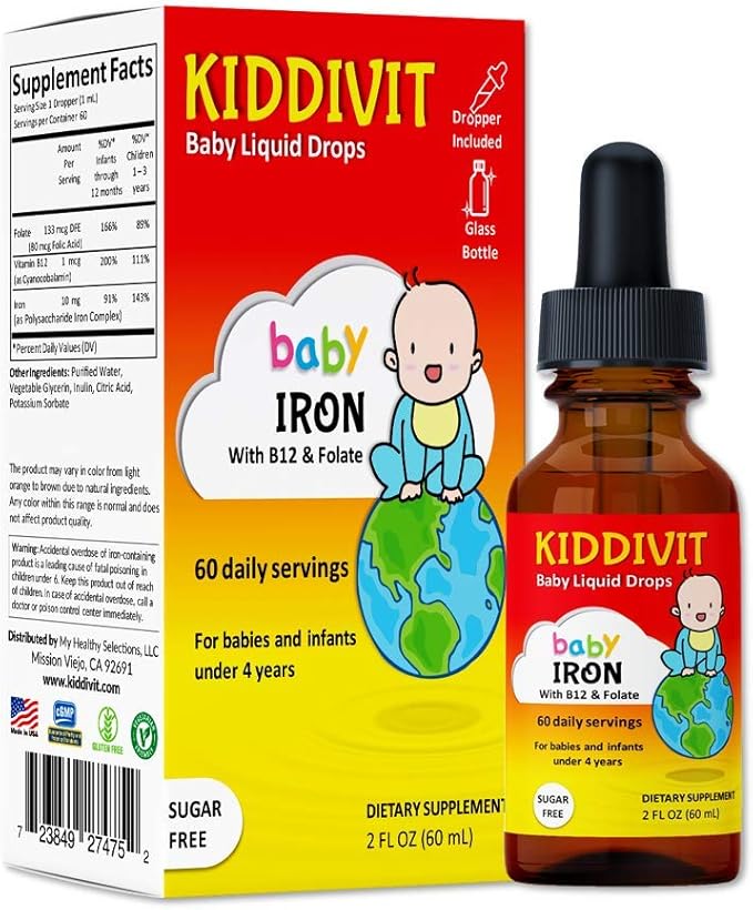Kiddivit Baby Iron Liquid Drops with Vitamin B12 & Folate - 60 Daily Servings, 2 Fl Oz (60 mL) - Inulin Fortified (Prebiotic, Dietary Fiber) - Sugar Free, Gluten Free, Vegetarian Friendly