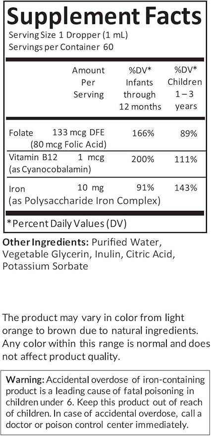 - Just One Dropper Per Day – Each dropper (1 mL) contains 10 mg of Iron (as polysaccharide complex), 1 mcg of Vitamin B12, and 133 mcg DFE of Folate.