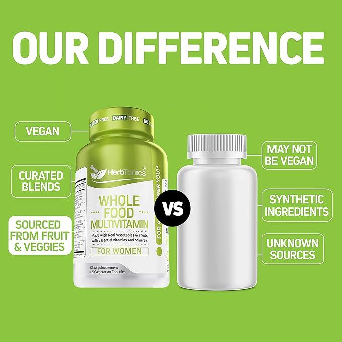Herbtonics Whole Food Multivitamin for Women | Made with Superfoods, Real Raw Veggies, Fruits, Vitamin E, A, B Complex | Womens Multivitamin | Non-GMO 120 Vegan Capsules