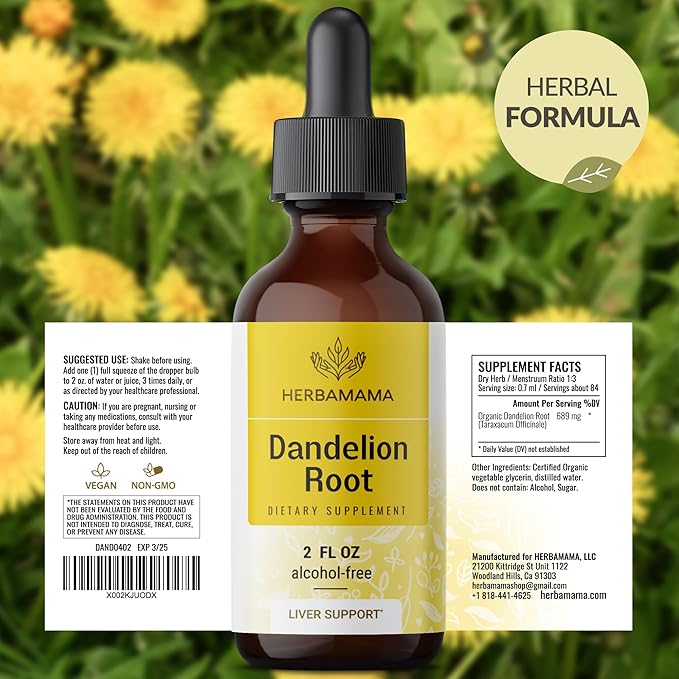 - Liver Cleanse: Each drop of Herbamama's Dandelion root extract is crafted to support liver and kidney health. Our Dandelion tincture provides liver and kidney detox, ensuring overall well-being.