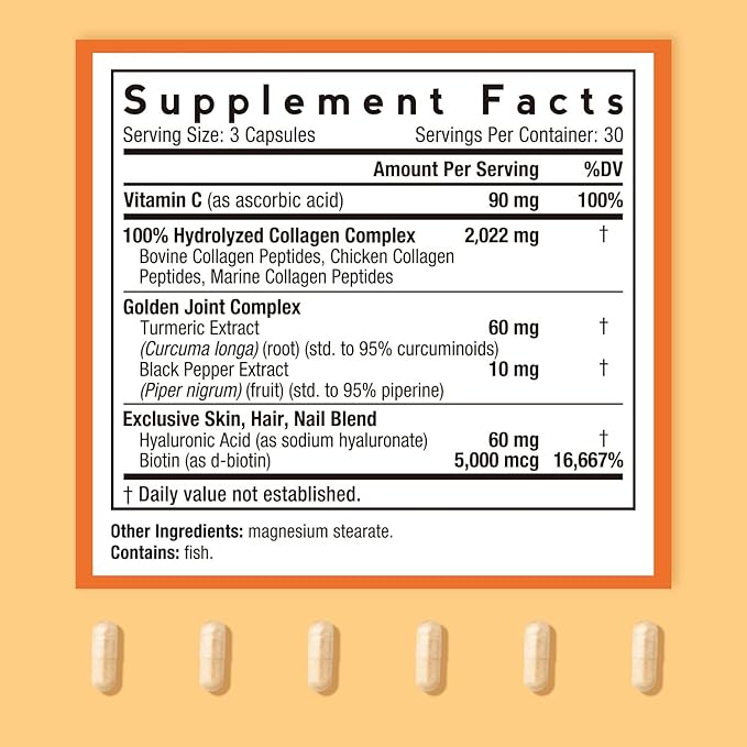 - Comfort Your Joints & Bones with Turmeric*: Besides the well-known properties of nourishing skin, hair & nails, collagen is also an incredible joint supporter.* To provide bones with MAXIMUM flexibility & strength, we introduced Golden Turmeric & Black Pepper. Curcumin helps joint health while black pepper enhances absorption.* Take 3 golden capsules daily and enjoy a vibrant & active life with flexible joints & bones free of discomfort.*