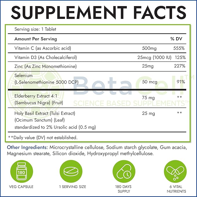 - SUPER INGREDIENTS FOR WELLNESS SUPPORT: BetaCell Wellness Formula is a combination of Vitamin C, Vitamin D3, Zinc, Elderberry, Holy Basil and Selenium. It has an advanced formula for building a healthy lifestyle. All the ingredients used in this wellness formula have synergistic activity.