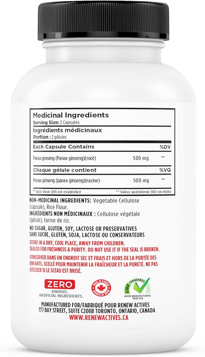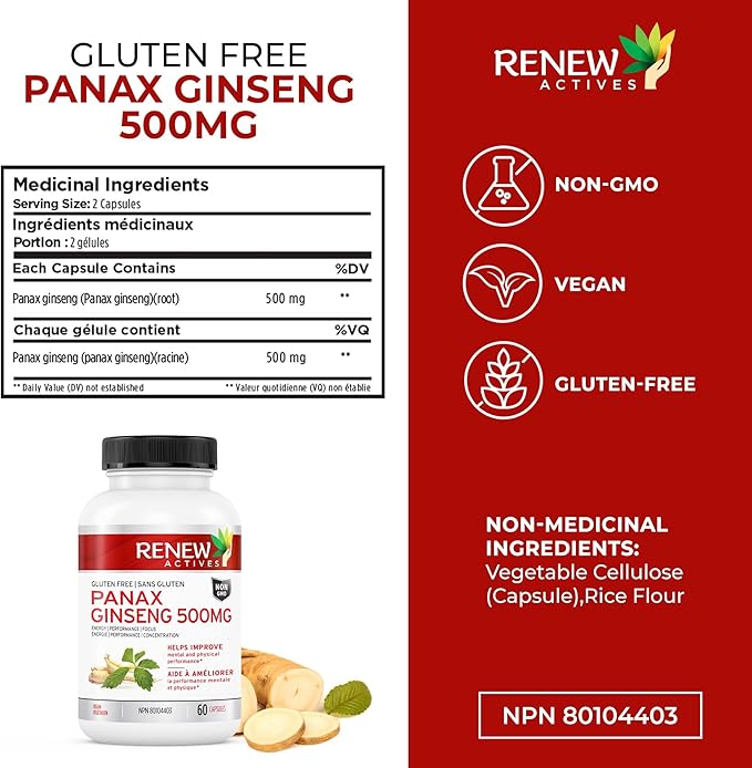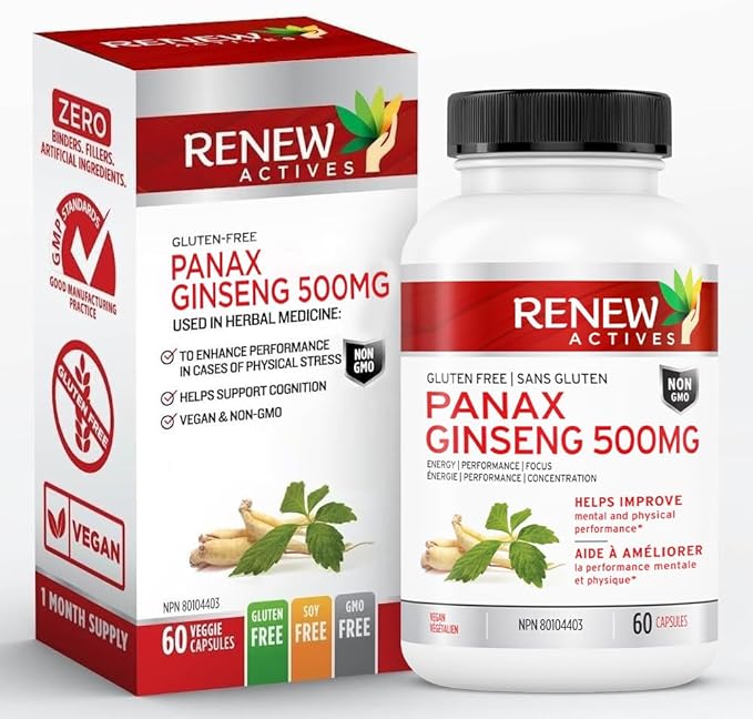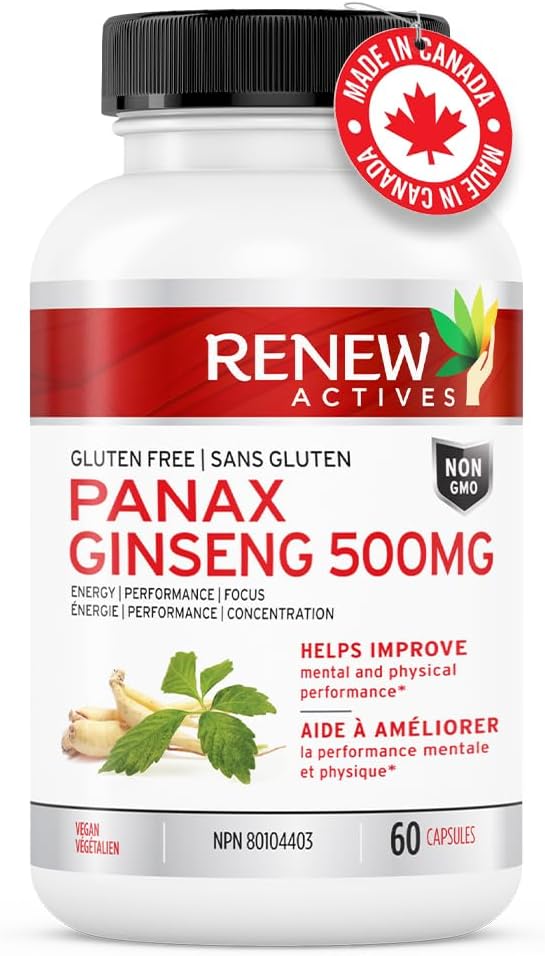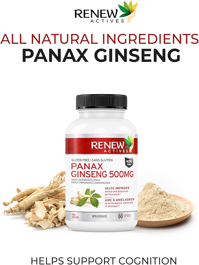 - ENERGY AMPLIFICATON: Feel revitalized with Renew Actives Panax Ginseng Capsules. This potent herb helps to increase energy levels, ensuring you stay energized throughout the day, even during the most demanding tasks. NPN: 80104403